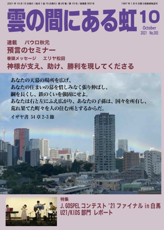 <表紙のみことば> <巻頭メッセージ> <巻頭言> <特別レポート> <連載> サンディエゴの風2 賛美隊が行く! ギフツ日記 世界に伝えたい! 礎の石フォトエッセイ <表紙の虹> |